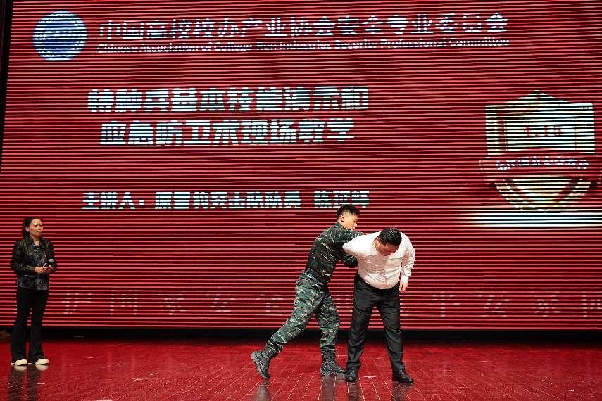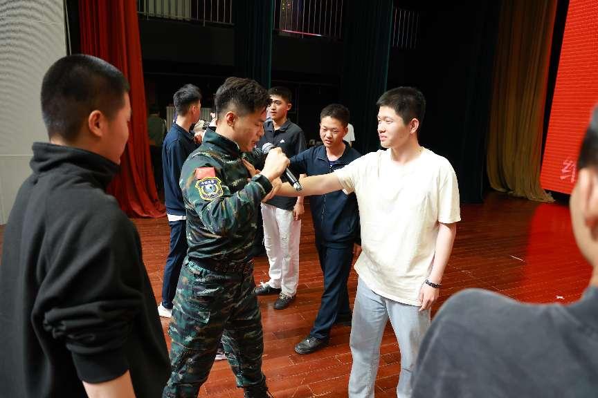 在技能展示环节,原雪豹突击队特战队员陈延峰为同学们演示了在遭遇不法侵害时实用的自我保护技巧。他专业娴熟的动作,引得现场掌声与惊叹声此起彼伏。在教学实践环节,陈延峰更是亲自上手,手把手指导学生完成简易应急防护动作。同学们热情高涨,积极响应与参与,现场氛围热烈而融洽。通过实际操作,同学们将理论知识转化为实践能力,进一步增强了自身的安全防范意识与应对能力。