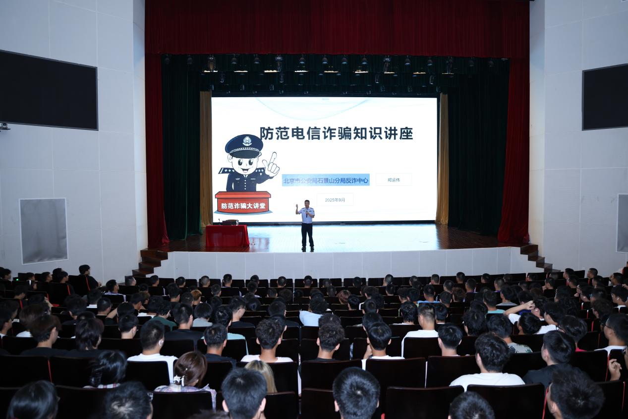 在防诈骗主题教育讲座中,特邀石景山公安分局邢运伟警官通过视频还原真实案例、揭露犯罪手法,系统传授实用防范技巧。他重点强调“不轻信、不转账、不泄露”的防骗原则,指导学生安装使用国家反诈中心APP。讲座设置情景模拟和互动问答环节,有效提升了同学们识别与应对诈骗的能力。